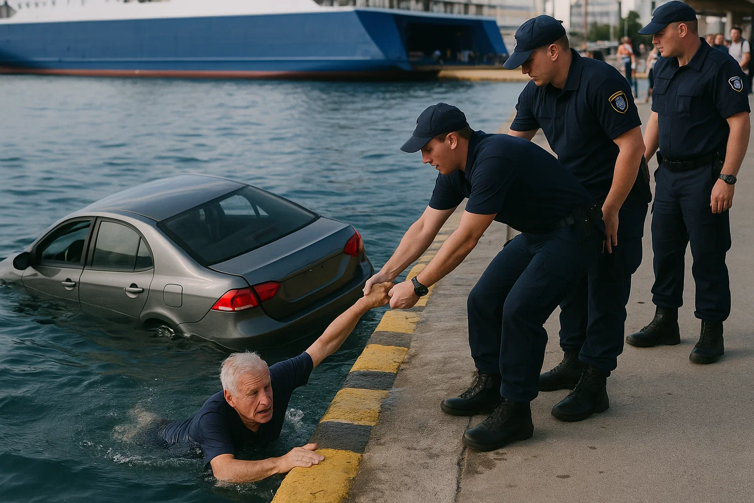 Ο οδηγός, διατηρώντας ψυχραιμία, κατάφερε να απομακρυνθεί εγκαίρως από το βυθιζόμενο αυτοκίνητο. Σύμφωνα με πληροφορίες, βούτηξε έξω από την καμπίνα και κολύμπησε μόνος του προς την προβλήτα, όπου στελέχη του Λιμενικού Σώματος τον βοήθησαν να ανέβει με ασφάλεια.