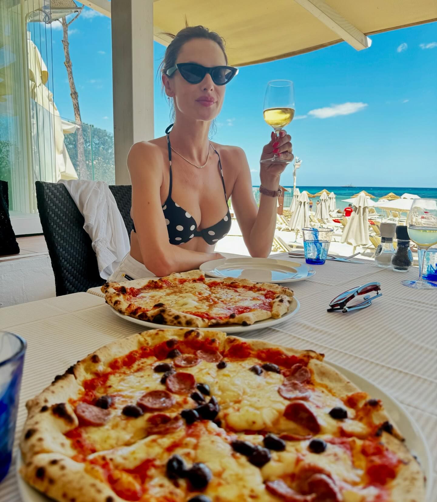 Στις φωτογραφίες, η Alessandra απολαμβάνει τον ζεστό ήλιο σε ένα παραθαλάσσιο εστιατόριο, φορώντας ένα κομψό μπικίνι με πουά που συμπληρώνει τέλεια το κομψό αλλά χαλαρό της στυλ. Με ένα ζευγάρι στιλάτα γυαλιά ηλίου σε σχήμα γάτας που προσθέτουν μια πινελιά ρετρό γοητείας, σηκώνει ένα ποτήρι λευκό κρασί, ενσαρκώνοντας την απόλυτη διάθεση διακοπών.