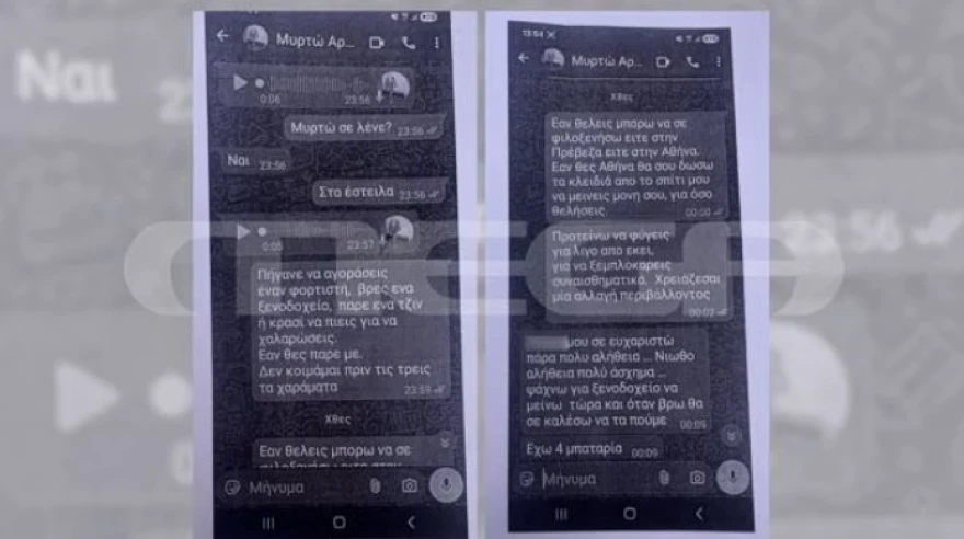 Η επικοινωνία τους διήρκεσε μέχρι τις 04:02 τα ξημερώματα. Η Μυρτώ ήταν ξαπλωμένη στο κρεβάτι του δωματίου που τελικά αποδείχθηκε το «σκηνικό» του θανάτου της. Η κλήση τερματίστηκε απότομα όταν κάποιος μπήκε στο δωμάτιο. Ήταν η τελευταία φορά που ο 66χρονος την είδε ζωντανή.