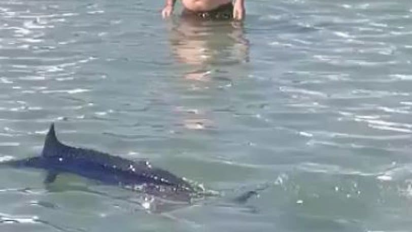 Εκεί λοιπόν έκανε την εμφάνισή του ένας ξιφίας, τον οποίο στην αρχή κάποιοι τον πέρασαν για καρχαρία, με αποτέλεσμα να τρέχουν να βγουν έξω.Στη συνέχεια όμως αφού διαπιστώθηκε οτι επρόκειτο για ξιφία κάποιοι άρχισαν να τον κυνηγάνε….