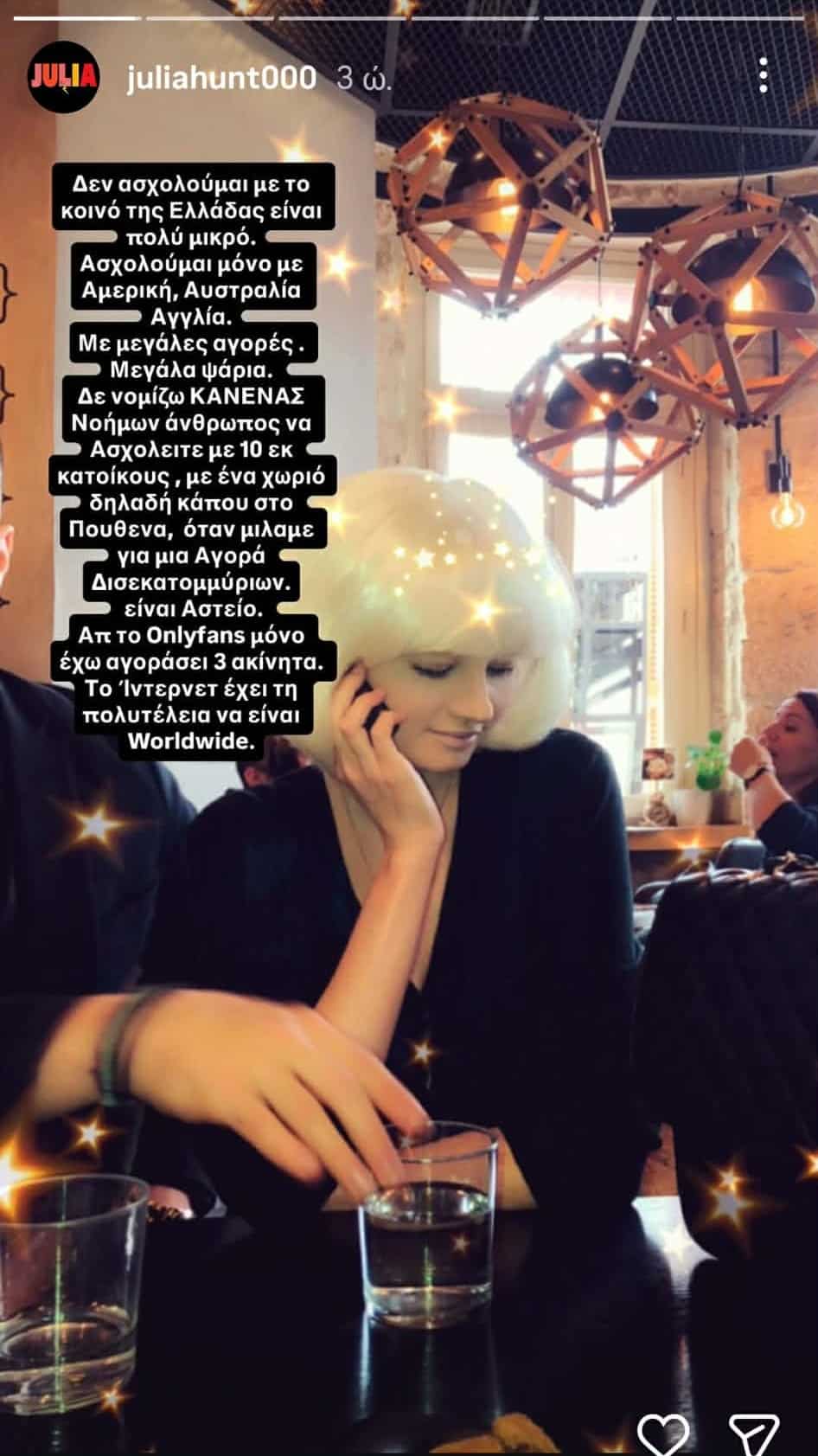 Σε ένα πρόσφατο story της, η Τζούλια ξεκαθάρισε πως το ελληνικό κοινό δεν αποτελεί πλέον προτεραιότητα για την ίδια, χαρακτηρίζοντάς το «πολύ μικρό». Με αιχμηρό ύφος, δήλωσε πως επικεντρώνεται αποκλειστικά σε μεγάλες αγορές όπως η Αμερική, η Αυστραλία και η Αγγλία, τις οποίες αποκάλεσε «μεγάλα ψάρια».