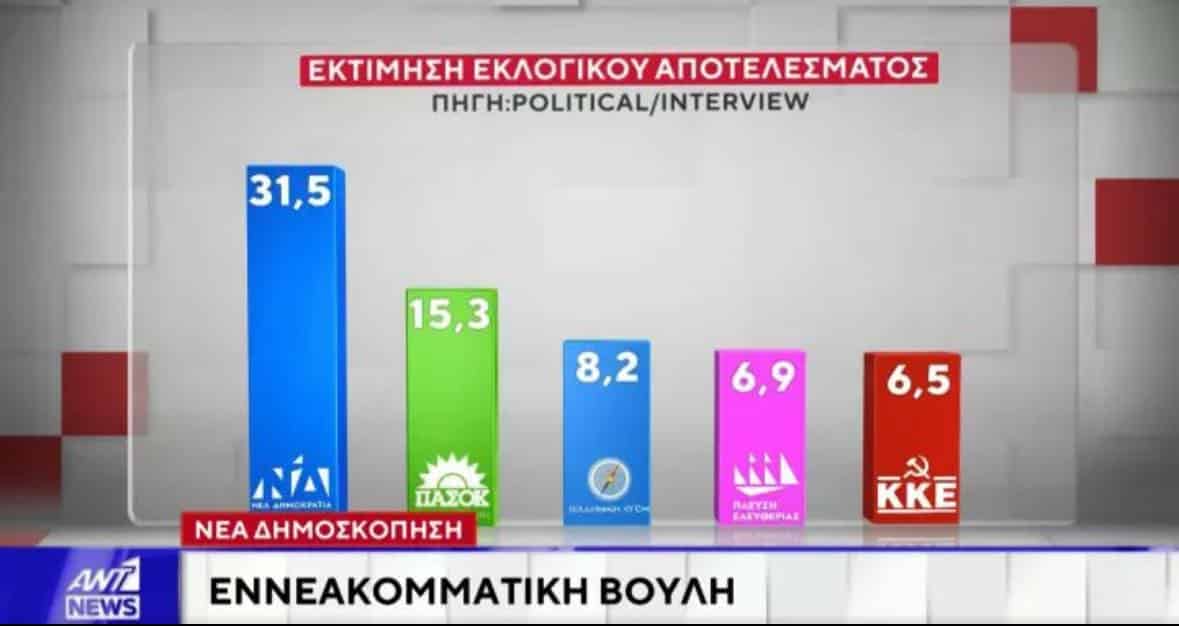 Η τελευταία έρευνα της Interview για την εφημερίδα Political αποτυπώνει τη νέα πολιτική ισορροπία που φαίνεται να διαμορφώνεται μετά την παραίτηση του Αλέξη Τσίπρα από τη Βουλή και τα σενάρια ίδρυσης νέου κόμματος. Την ίδια στιγμή, η Νέα Δημοκρατία διατηρεί καθαρό προβάδισμα, ενώ ο ΣΥΡΙΖΑ καταγράφει ιστορικά χαμηλά ποσοστά.