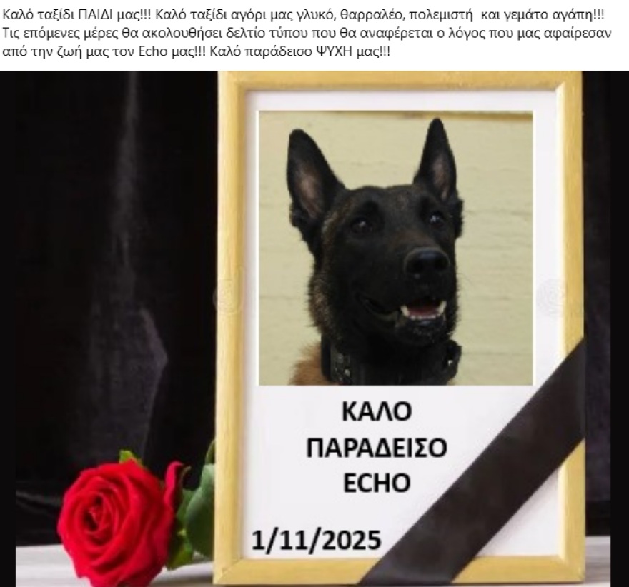 Δεν ήταν απλώς ένας σκύλος αναζήτησης. Ήταν ένας αθόρυβος ήρωας, ένας πολύτιμος συνεργάτης που έδωσε ελπίδα σε οικογένειες που αναζητούσαν τους δικούς τους. Ο Echo δεν είναι πια εδώ. Και η απώλεια είναι βαριά.