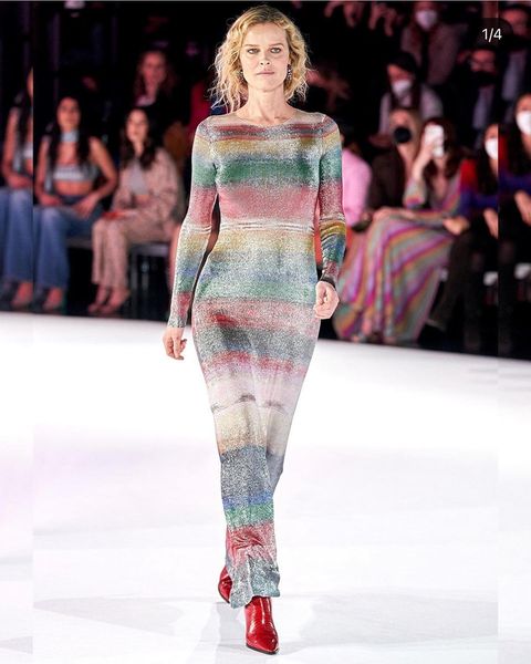 Συνεχίζοντας το σερί της στην Εβδομάδα Μόδας του Μιλάνου, η Herzigová έκλεισε το σόου της Missoni την Παρασκευή, φορώντας ένα μάξι φόρεμα Lurex με μακριά μανίκια και κόκκινες μπότες.