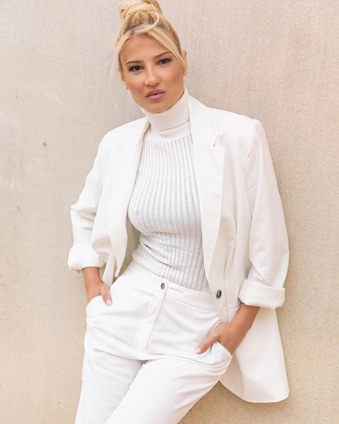 Η Σκορδά προτιμάει λοιπόν τα matching sets, σε διάφορα χρώματα. Η παρουσιάστρια εδώ έχει προτιμήσει ένα total white σύνολο, συνδυάζοντας ένα λευκό μπλέιζερ με κοντομάνικο ζιβάγκο και παντελόνι σε ίσια γραμμή.