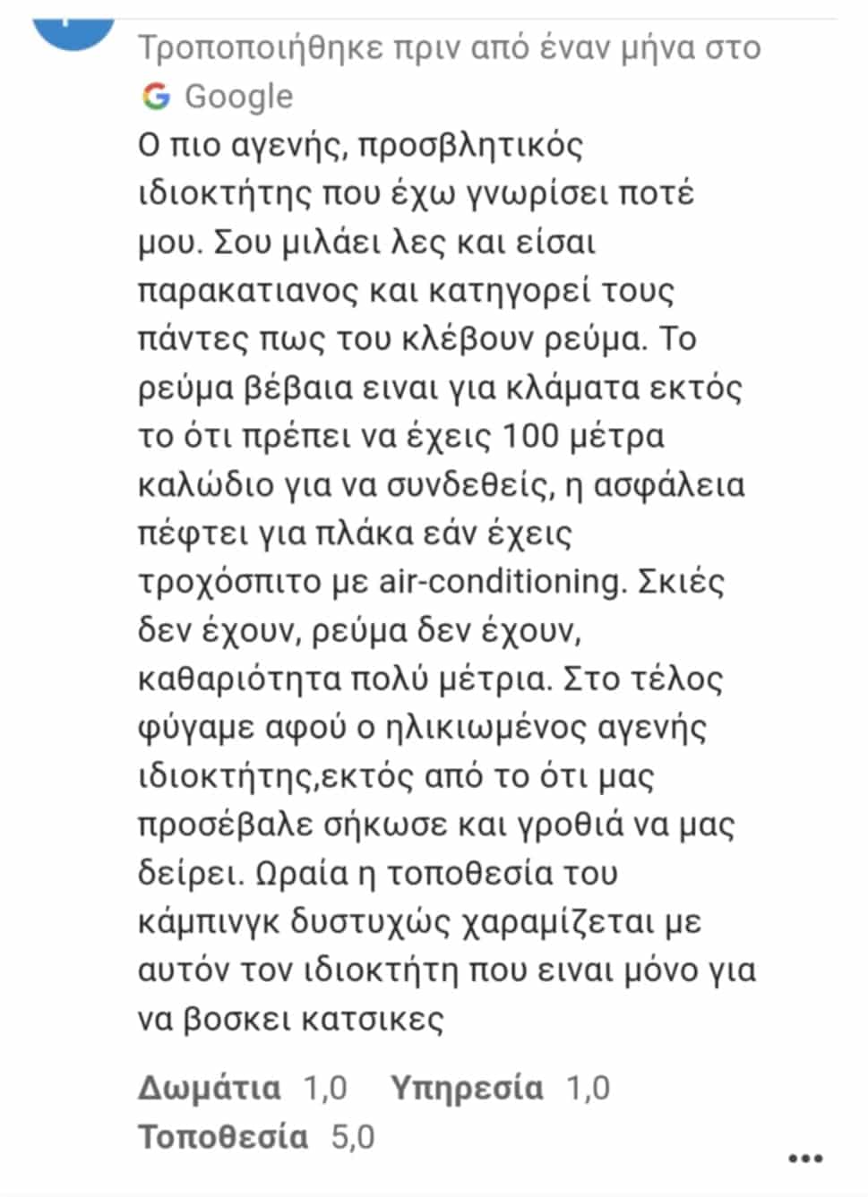 Η σύγκρουση που αποτυπώνεται στις διαδικτυακές αξιολογήσεις φαίνεται σήμερα τρομακτικά προφητική. Μέσα σε λίγες ημέρες, η εικόνα ενός κατά τα άλλα ήσυχου κάμπινγκ μετατράπηκε σε πεδίο λεκτικής σύγκρουσης, με δημόσιες κατηγορίες, προσωπικές απαντήσεις και ειρωνικά υπονοούμενα. Και λίγο μετά, ο ιδιοκτήτης βρέθηκε νεκρός.