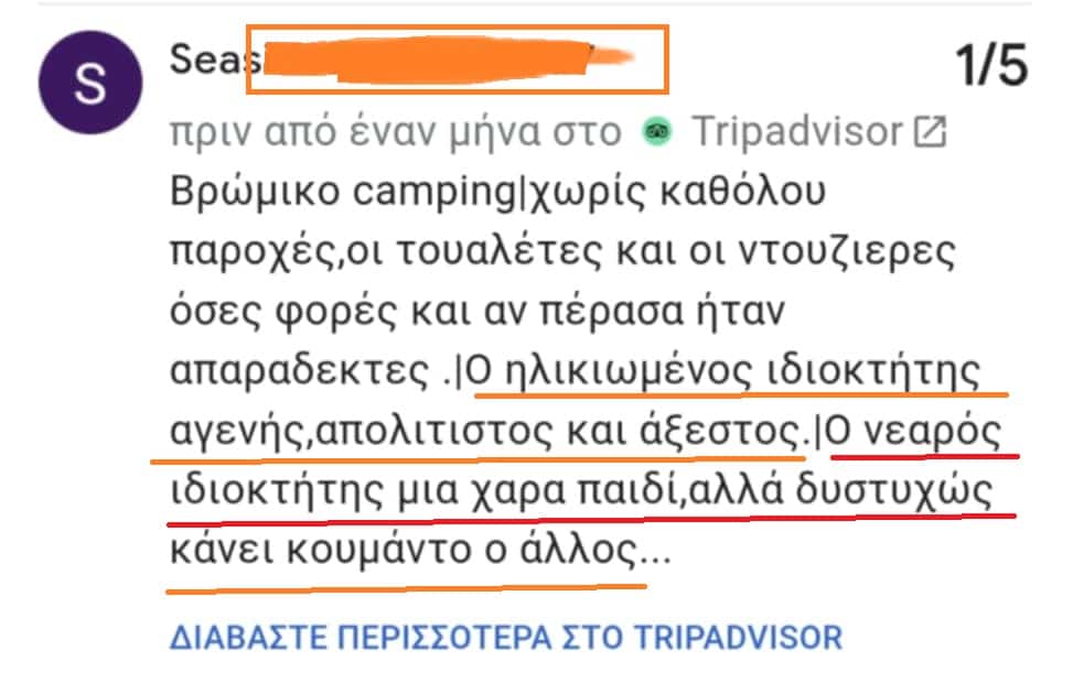 Τα σχόλια αυτά δεν επικεντρώνονταν στις παροχές ή στην καθαριότητα, αλλά σε προσωπικές επιθέσεις προς τον ίδιο τον επιχειρηματία. Οι φράσεις ήταν φορτισμένες, πολλές φορές με οργισμένο ή ειρωνικό ύφος, γεγονός που δείχνει πως δεν επρόκειτο για απλή δυσαρέσκεια πελατών.