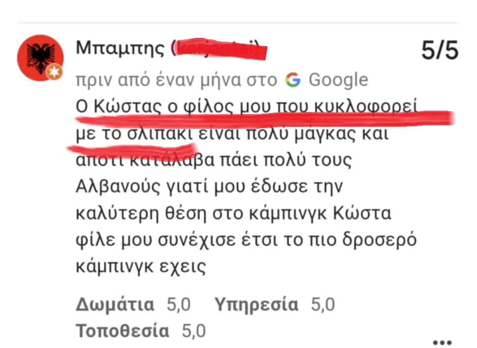Ανάμεσα στα θετικά σχόλια που αναρτήθηκαν μέσα στο ίδιο χρονικό διάστημα, ξεχωρίζει και μια αναφορά σε «φιλοαλβανική στάση» του ιδιοκτήτη, με υπονοούμενα για εύνοια σε αλλοδαπούς  πελάτες. Το ύφος του συγκεκριμένου σχολίου είναι ειρωνικό και προκαλεί αίσθηση, αφού συνδέει την επαγγελματική συμπεριφορά του 68χρονου με εθνικές προκαταλήψεις – κάτι που δεν έχει καμία θέση σε μια απλή αξιολόγηση καταλύματος.