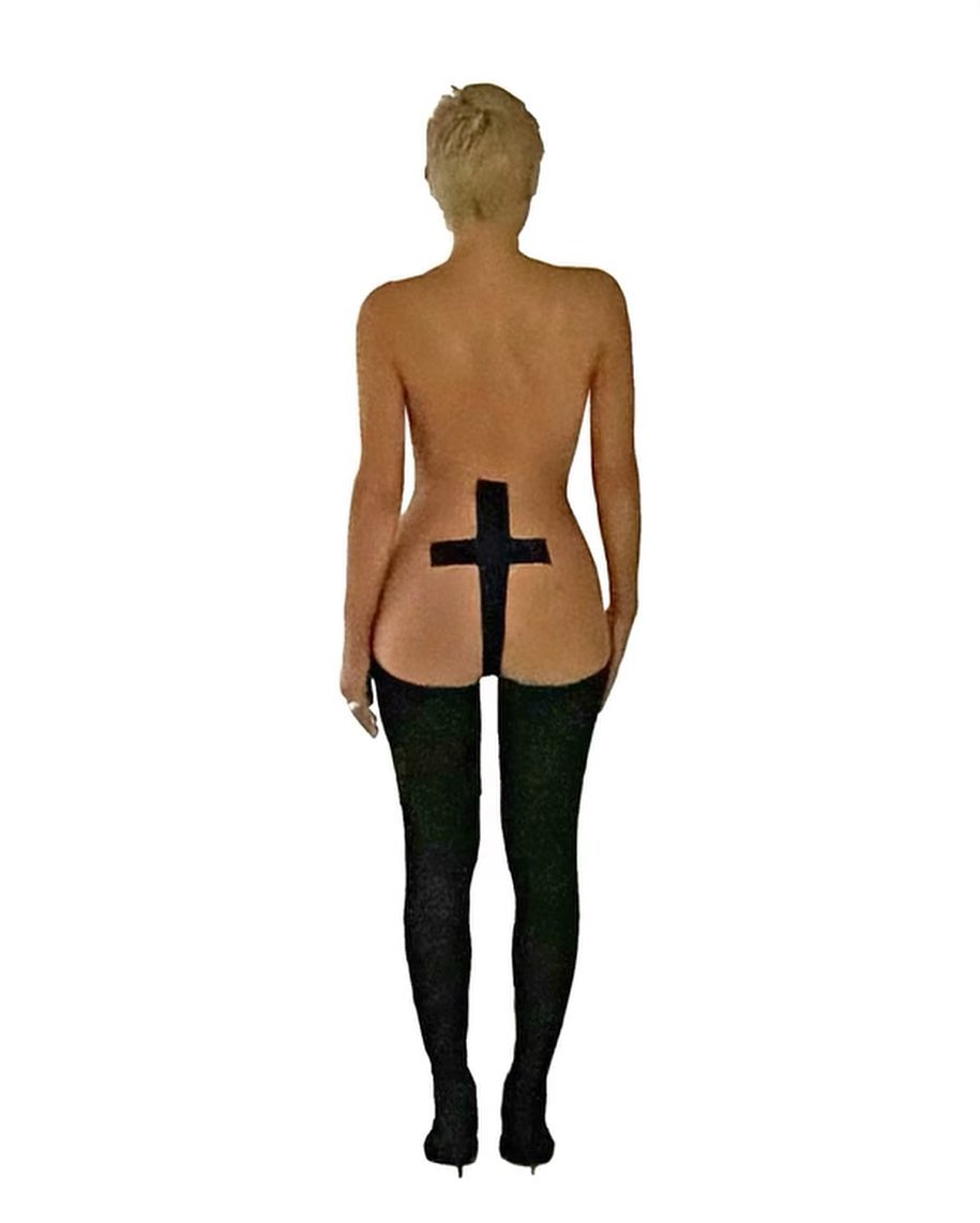 Φοράει ένα μαύρο τετράγωνο υλικό που καλύπτει το στήθος της, ενώ ένας μαύρος σταυρός καλύπτει τα οπίσθια της.Μια μαύρη λωρίδα οριακά καλύπτει τον κόλπο της … και αυτό είναι περίπου.