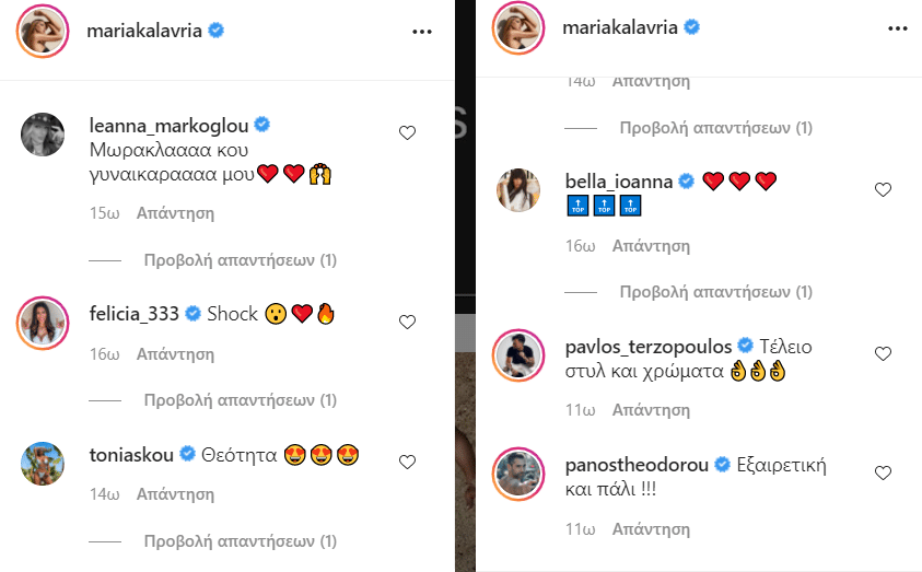 Αυτό που γίνεται όταν η Μαρία Καλάβρια ανεβάζει φωτογραφία στο Instagram δεν το συναντάμε εύκολα αφού γνωστά celebrity αποθεώνουν τις φωτογραφίες και το στυλ της με κολακευτικά σχόλια και με ιδιαίτερα μεγάλη θέρμη.
