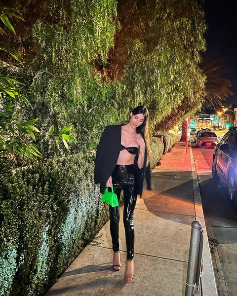 Συγκεκριμένα η Ηλιάνα Παπαγεωργίου προτίμησε ένα vinyl bra top με χρυσές αλυσίδες και ασορτί κολάν, το οποίο συνδύασε με ένα ανδρικό oversized blazer jacket. Το look της ολοκλήρωσε με ψηλοτάκουνα πέδιλα και green neon bag.