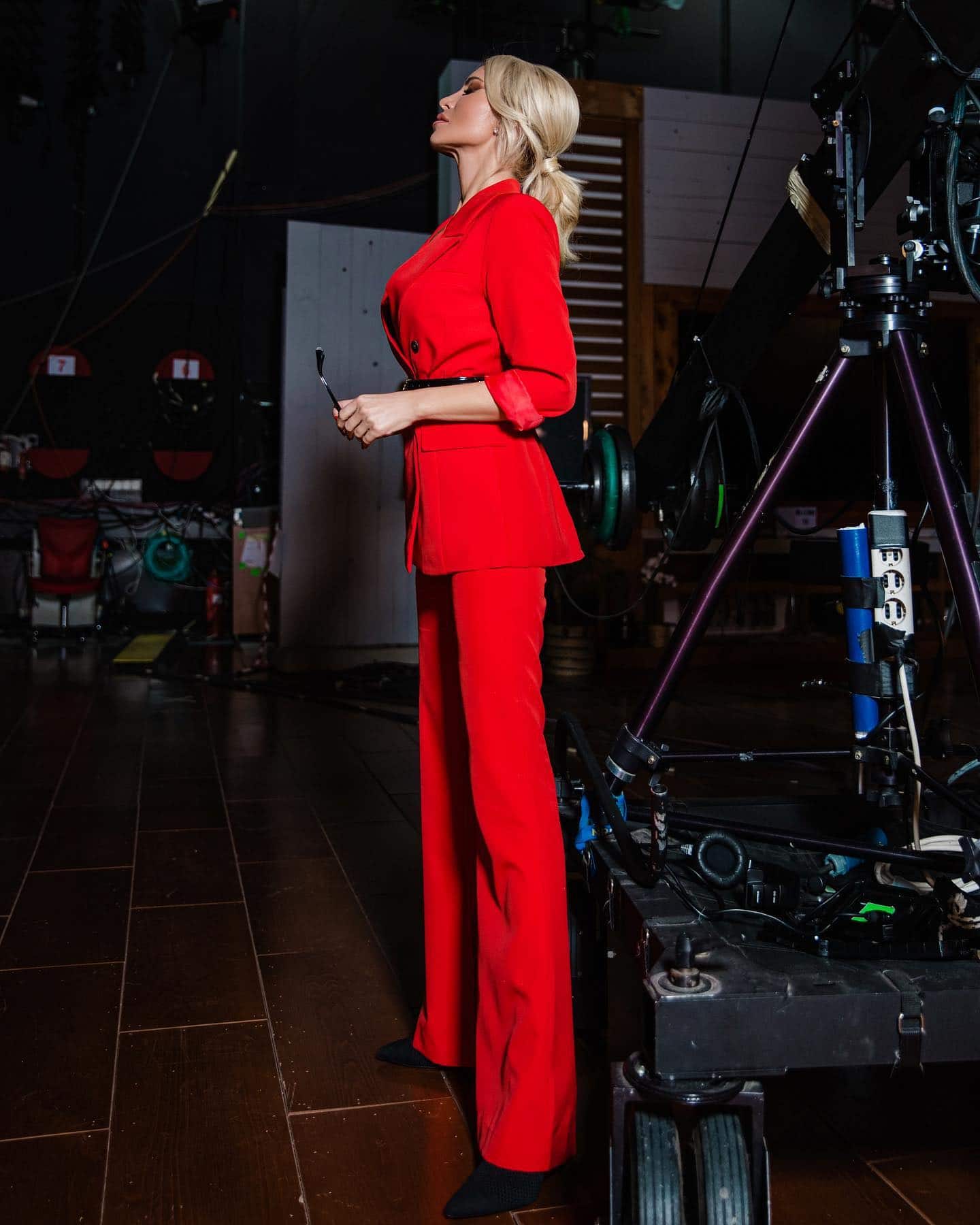 Πιθανότατα βρίσκεται στο backstage του πλατό της εκπομπής της στον ALPHA, «Super Κατερίνα». Το σίγουρο είναι πως το κόκκινο χρώμα της πάει πολύ, την φωτίζει και της χαρίζει σεξαπίλ. Το σικάτο blazer με το βαθύ ντεκολτέ σε σχήμα V κολακεύει το στήθος της, κάνοντας τα ανδρικά βλέμματα «να πέσουν» σε αυτό το σημείο, αλλά και να μείνουν εκεί για μερικά δευτερόλεπτα. Παράλληλα, η 36χρονη παρουσιάστρια έχει τονίσει τη λεπτή μέση της με μία μαύρη και κλασική ζώνη.