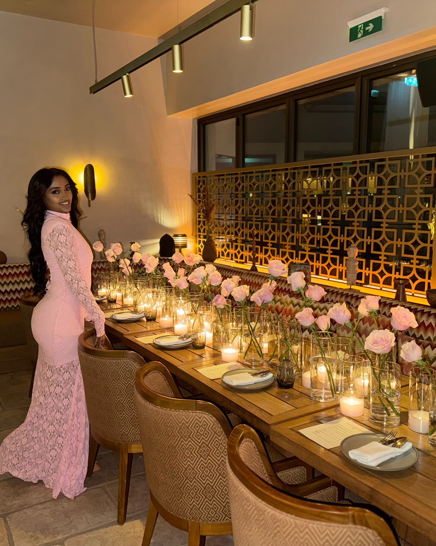 Η Μεκκόνεν, με ένα ρομαντικό και απόλυτα θηλυκό look, εντυπωσίασε με τη ροζ δαντελένια τουαλέτα της, δίπλα σε ένα μακρύ τραπέζι διακοσμημένο με τριαντάφυλλα και κεριά που έδωσαν έναν παραμυθένιο τόνο στη βραδιά. Το μενού περιλάμβανε εκλεκτές γεύσεις με ψάρι και sushi, ενώ στη συνέχεια η διασκέδαση για τις γυναίκες μεταφέρθηκε σε νυχτερινό μαγαζί, με ποτό και χορό μέχρι τις πρώτες πρωινές ώρες.
