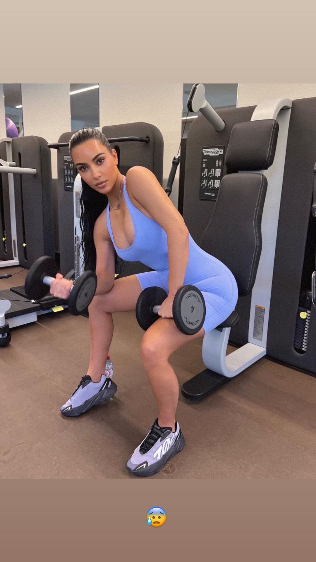 Η ιδρύτρια της εταιρείας γυναικείων ενδυμάτων SKIMS προτίμησε να μην απαντήσει σε όσους της άσκησαν κριτική. Λίγη ώρα μετά, όμως, ανάρτησε στα Instagram Stories της μία άλλη φωτογραφία της από το γυμναστήριο, όπου κάθεται σε ένα μηχάνημα γυμναστικής, κρατώντας δύο βαράκια.
