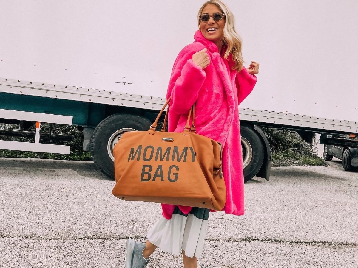 Φορώντας μία υπέροχη, φούξια γούνα και κρατώντας μία μεγάλη τσάντα σε καφέ απόχρωση, πάνω στην οποία σημειώνεται με μαύρα, μεγάλα γράμματα «MOMMY BAG», περπατά σε κάποιον δρόμο, χαμογελά και το πρόσωπό της λάμπει από ευτυχία.