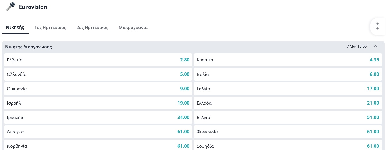 Αξίζει να σημειωθεί ότι οι αποδόσεις στα στοιχήματα αλλάζουν συνεχώς, λαμβάνοντας υπόψη διάφορους παράγοντες, όπως τις εμφανίσεις στις πρόβες, τις δημοσκοπήσεις και την άποψη των ειδικών.