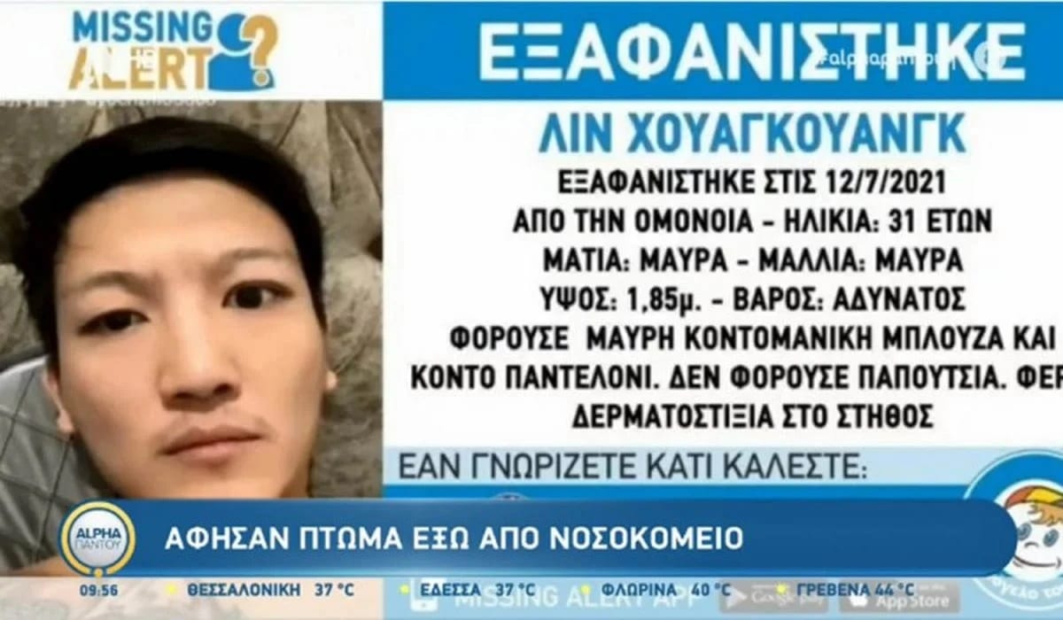 Το πτώμα ενός άντρα κινέζου 31 ετών ο οποίος είχε εξαφανιστεί στις 12 Ιουλίου από την Ομόνοια και είχε βγει missing Alert εγκατέλειψαν άγνωστοι έξω από νοσοκομείο