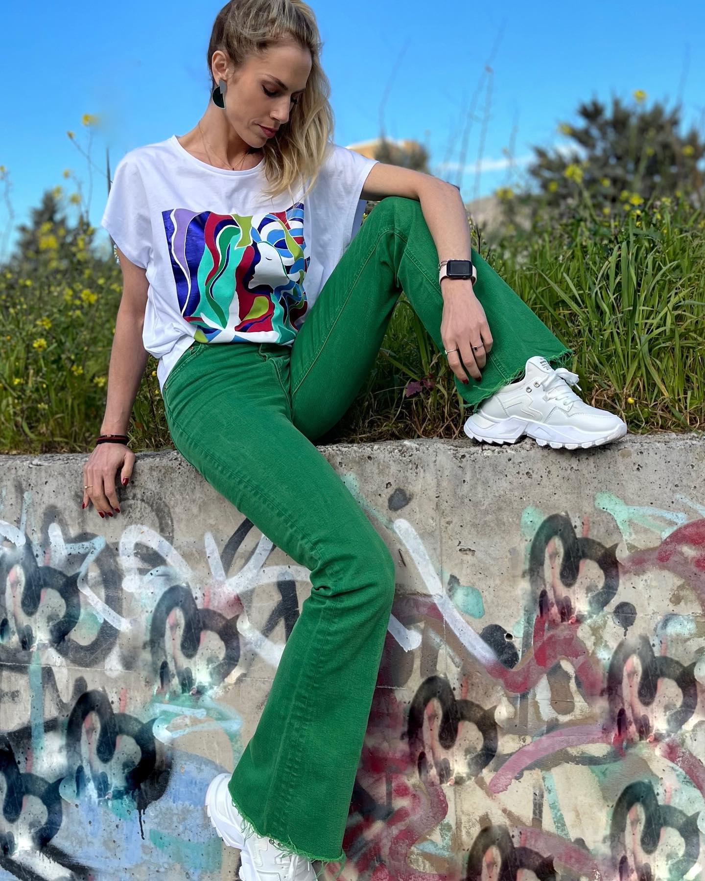 Το πράσινο παντελόνι με την ελαφριά καμπάνα κολακεύει τα καλλίγραμμα πόδια της, ενώ το λευκό t-shirt με την πολύχρωμη στάμπα της χαρίζει άνεση, στιλ και φυσικά είναι ιδανικό για την ανοιξιάτικη περίοδο. Τα μοντέρνα, κρεμαστά σκουλαρίκια αναβαθμίζουν το outfit της, ενώ το μπορντό μανικιούρ της προσδίδει κομψότητα. Όσον αφορά τα λευκά sneakers, αποτελούν και φέτος το must have της ντουλάπας μας και το σημαντικότερο ταιριάζουν με όλα τα χρώματα, αλλά και με διάφορα ρούχα, όπως τζιν, κολάν, φούστα ή φόρεμα.