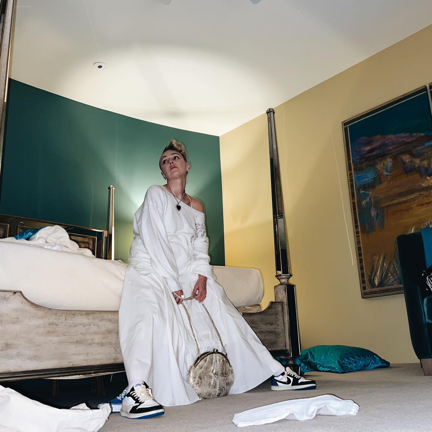 Τέλος, σε μια βραδινή της εμφάνιση, φόρεσε μάξι λευκό φόρεμα, με φαρδιά γραμμή αλλά ρομαντικό χαρακτήρα και το συνδύασε με sneakers. Πρόσθεσε statement αξεσουάρ, όπως το χρυσό βραδινό τσαντάκι και το ασημένιο περιδέραιο, με μεγάλη μπλε καρδιά και διάφορα άλλα χρυσά και ασημένια κοσμήματα.