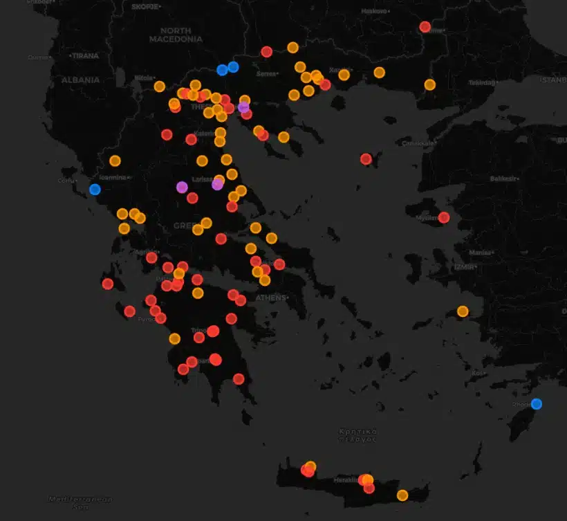 Με βάση τον διαδραστικό χάρτη του Jo Di (jodi.graphics/bloka), δεκάδες σημεία σε όλη την Ελλάδα βρίσκονται αποκλεισμένα ή υπό μερικό αποκλεισμό.